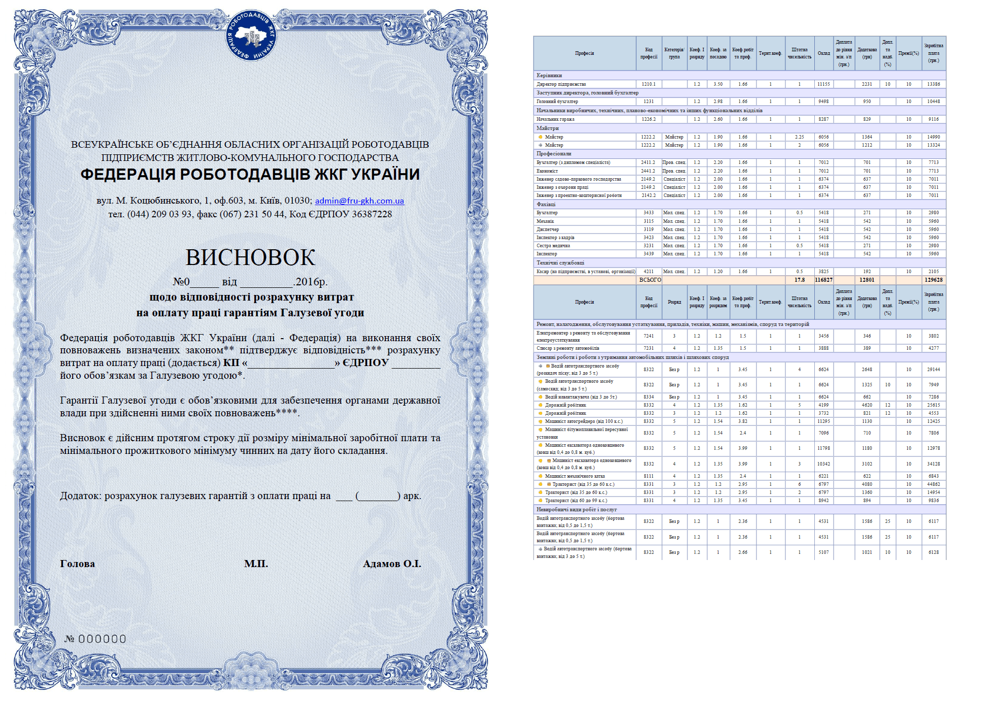 - Розрахунок та підтвердження галузевих гарантій оплати праці роботодавця (із наданням Висновків встановленого зразка)